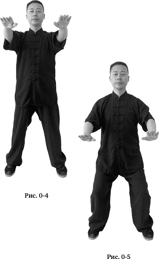 С выдохом немного присесть, согнув колени и таз, руки опустить перед собой до уровня живота, нажимая ладонями вниз (рис. 0–2, 0–3, 0–4, 0–5).