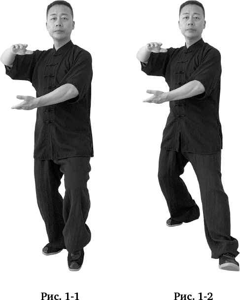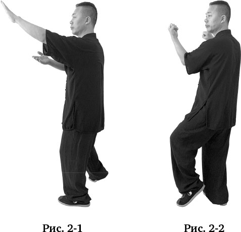 Повернуться на 90° налево, вес перенести на левую ногу, руки круговым движением провести влево против часовой стрелки, левая движется по большому кругу до диагонали влево-вверх, ладонь направлена вниз, правая – по малому кругу ладонью вверх, ладонь правой доходит до локтя левой. Взгляд в сторону ладони левой руки, ладони направлены в противоположные стороны (рис. 2–1). Перенести вес на правую ногу, левую приставить рядом на носок, одновременно сжать кулаки и сделать люй вправо (рис. 2–2).