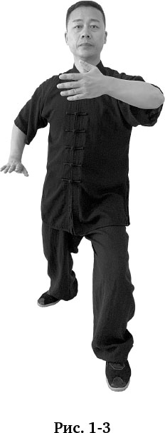 Перенести вес на правую ногу, левую приставить рядом на носок, руками обхватить «шар» справа, ладони направлены друг к другу, сделать шаг левой ногой вперёд в направлении юга, переходя в стойку лучника гунбу с одновременным левым пэн руками (рис. 1–1, 1–2, 1–3).