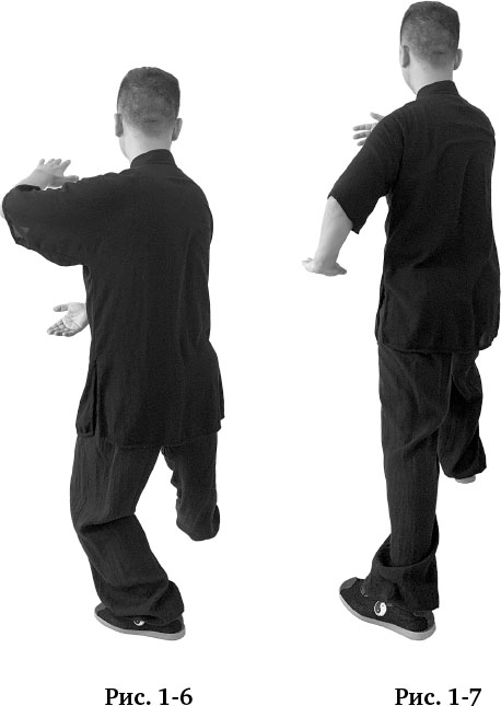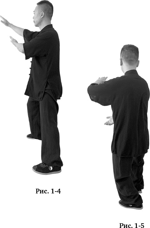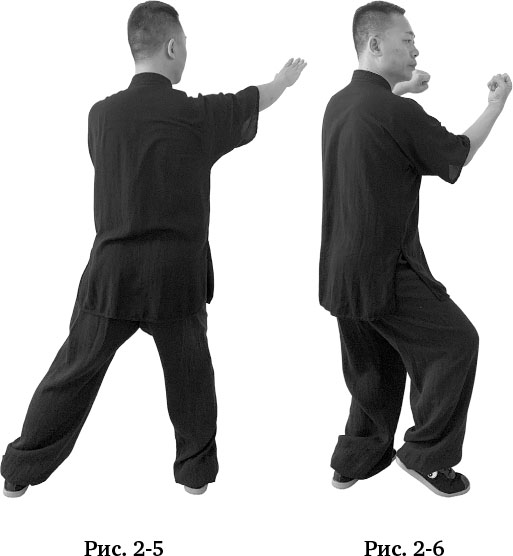 Перенести вес на левую ногу, ещё повернуть корпус немного вправо, окончательное направление на восток, правую ногу приставить рядом с левой на носок, одновременно сжать руки в кулаки и сделать люй влево (рис. 2–5, 2–6).