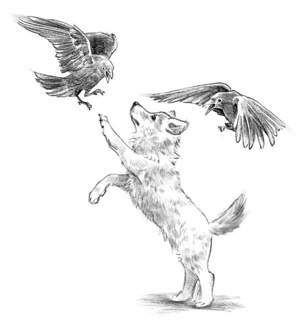 Здесь развернулось самое настоящее поле боя. И это было… просто ужасно весело! Пятая рванула к братьям и сестре и вслед за ними тоже попыталась поймать ворона. Теперь она поняла правила игры: ловить птиц нужно было не лапами, а ртом. Вороны громко каркали от удовольствия, а волчата повизгивали от волнения. В эту игру волки и вороны играли с незапамятных времён, и всегда она становилась началом дружбы на всю жизнь.