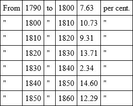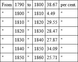 That the Tariff has produced none of these results, is shown by the fact that the agriculture and commerce of Pennsylvania vastly exceed those of Virginia, and yet these are the interests supposed to be most injuriously affected by high tariffs. But there is still more conclusive proof. The year 1824 was the commencement of the era of high tariffs, and yet, from 1790 to 1820, as proved by the Census, the percentage of increase of Pennsylvania over Virginia was greater than from 1820 to 1860. Thus, by Table 1 of the Census, p. 124, the increase of population in Virginia was as follows:
