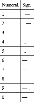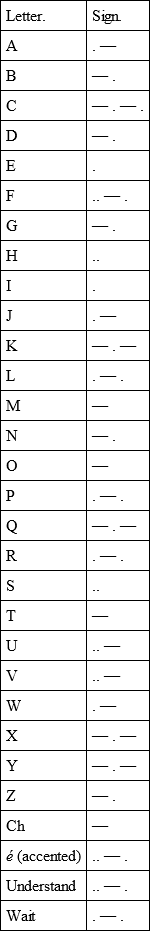 We have thus the two stations connected by a cable. At the station sending the message there is the battery, from which the current proceeds; the sending instrument, for letting the current into the cable, or stopping it; and the 'earth-plate,' or metal connection between one pole of the battery and the earth. At the station receiving the message there is the receiving instrument, and again the earth-plate, connecting the earth into circuit. These separate parts of the circuit, as we have already said, must be 'connected up,' as it is termed, so as to provide a complete conducting channel for the current to flow in from one pole of the battery to the distant place and back again (or virtually so) through the earth. Only at one place can the circuit be interrupted and the current consequently stopped – that is, at the key of the sending instrument. Here then the sending clerk sits, and by manipulating the lever of this key he 'makes and breaks' the circuit at will, and thereby controls the current. The regulated making and breaking of this connection is the basis of telegraphing, whether by submarine cable or by the ordinary land lines. Accordingly as the clerk maintains the circuit for a longer or a shorter time, so will the current give longer or shorter indications on the receiving instrument at the distant station: or again, according as the opposite poles of the battery are applied to the cable by the key, and the direction of the current consequently reversed in the cable, so will the indicated signals on the receiving instrument be of opposite kind. From the elementary short and long signals, or right and left signals, so obtained on the receiving instrument, a code of letters and words may be built up, and intelligible messages transmitted. The Morse Code is that universally adopted, and for the further information of our readers we here append it as it is usually written: