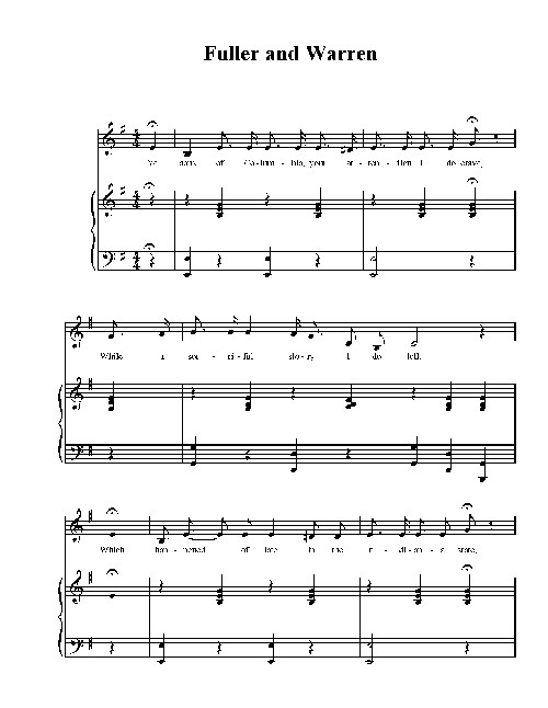 Ye sons of Columbia, your attention I do crave,While a sorrowful story I do tell,Which happened of late, in the Indiana state,And a hero not many could excel;Like Samson he courted, made choice of the fair,And intended to make her his wife;But she, like Delilah, his heart did ensnare,Which cost him his honor and his life.A gold ring he gave her in token of his love,On the face was the image of the dove;They mutually agreed to get married with speedAnd were promised by the powers above.But the fickle-minded maiden vowed again to wedTo young Warren who lived in that place;It was a fatal blow that caused his overthrowAnd added to her shame and disgrace.When Fuller came to hear he was deprived of his dearWhom he vowed by the powers to wed,With his heart full of woe unto Warren he did go,And smilingly unto him he said:"Young man, you have injured me to gratify your causeBy reporting that I left a prudent wife;Acknowledge now that you have wronged me, for although I break the laws,Young Warren, I'll deprive you of your life."Then Warren, he replied: "Your request must be denied,For your darling to my heart she is bound;And further I can say that this is our wedding day,In spite of all the heroes in town."Then Fuller in the passion of his love and anger bound,—Alas! it caused many to cry,—At one fatal shot killed Warren on the spot,And smilingly said, "I'm ready now to die."The time was drawing nigh when Fuller had to die;He bid the audience adieu.Like an angel he did stand, for he was a handsome man,On his breast he had a ribbon of blue.Ten thousand spectators did smite him on the breast,And the guards dropped a tear from the eye,Saying, "Cursed be she who caused this misery,Would to God in his stead she had to die."The gentle god of Love looked with anger from aboveAnd the rope flew asunder like the sand.Two doctors for the pay they murdered him, they say,They hung him by main strength of hand.But the corpse it was buried and the doctors lost their prey,Oh, that harlot was bribed, I do believe;Bad women to a certainty are the downfall of men,As Adam was beguiled by Eve.