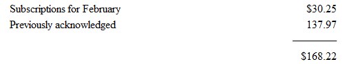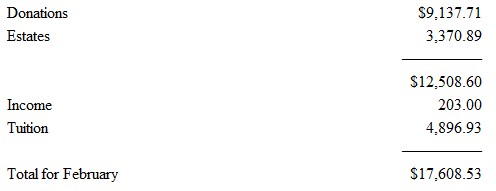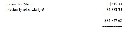 INCOME, $203.00Atterbury Endowment Fund, 5. Wm. Belden Sch'p Fund, for Talladega C., 30. H. Carter, Theo. Endowment Fund, 5. Rev. B. Foltz, Endowment Fund, 15. General Endowment Fund, 20. Howard Theo. Fund, for Howard U., 60. Le Moyne Fund, for Memphis, Tenn., 30. Straight U. Sch'p Fund, 10. Tuthill King Endowment Fund, for Atlanta U., 20. Yale Library Fund, for Talladega C., 8.