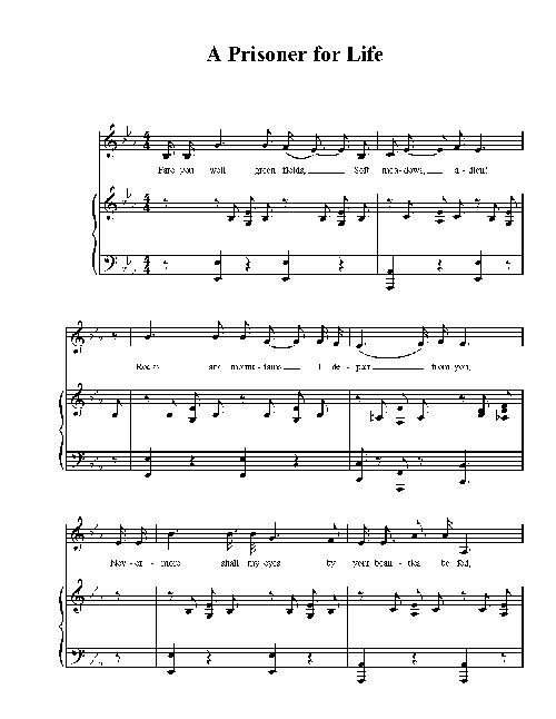 Fare you well, green fields,Soft meadows, adieu!Rocks and mountains,I depart from you;Nevermore shall my eyesBy your beauties be blest,Nevermore shall you sootheMy sad bosom to rest.Farewell, little birdies,That fly in the sky,You fly all day longAnd sing your troubles by;I am doomed to this cell,I heave a deep sigh;My heart sinks within me,In anguish I die.Fare you well, little fishes,That glides through the sea,Your life's all sunshine,All light, and all glee;Nevermore shall I watchYour skill in the wave,I'll depart from all friendsThis side of the grave.What would I giveSuch freedom to share,To roam at my easeAnd breathe the fresh air;I would roam through the cities,Through village and dell,But I never would returnTo my cold prison cell.What's life without liberty?I ofttimes have said,Of a poor troubled mindThat's always in dread;No sun, moon, and starsCan on me now shine,No change in my dangerFrom daylight till dawn.Fare you well, kind friends,I am willing to own,Such a wild outcastNever was known;I'm the downfall of my family,My children, my wife;God pity and pardonThe poor prisoner for life.