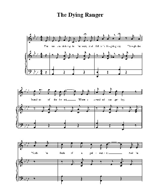 The sun was sinking in the westAnd fell with lingering rayThrough the branches of a forestWhere a wounded ranger lay;Beneath the shade of a palmettoAnd the sunset silvery sky,Far away from his home in TexasThey laid him down to die.A group had gathered round him,His comrades in the fight,A tear rolled down each manly cheekAs he bid a last good-night.One tried and true companionWas kneeling by his side,To stop his life-blood flowing,But alas, in vain he tried.When to stop the life-blood flowingHe found 'twas all in vain,The tears rolled down each man's cheekLike light showers of rain.Up spoke the noble ranger,"Boys, weep no more for me,I am crossing the deep watersTo a country that is free."Draw closer to me, comrades,And listen to what I say,I am going to tell a storyWhile my spirit hastens away.Way back in Northwest Texas,That good old Lone Star state,There is one that for my comingWith a weary heart will wait."A fair young girl, my sister,My only joy, my pride,She was my friend from boyhood,I had no one left beside.I have loved her as a brother,And with a father's careI have strove from grief and sorrovHer gentle heart to spare."My mother, she lies sleepingBeneath the church-yard sod,And many a day has passed awaySince her spirit fled to God.My father, he lies sleepingBeneath the deep blue sea,I have no other kindred,There are none but Nell and me."But our country was invadedAnd they called for volunteers;She threw her arms around me,Then burst into tears,Saying, 'Go, my darling brother,Drive those traitors from our shore,My heart may need your presence,But our country needs you more.'"It is true I love my country,For her I gave my all.If it hadn't been for my sister,I would be content to fall.I am dying, comrades, dying,She will never see me more,But in vain she'll wait my comingBy our little cabin door."Comrades, gather closerAnd listen to my dying prayer.Who will be to her as a brother,And shield her with a brother's care?"Up spake the noble rangers,They answered one and all,"We will be to her as brothersTill the last one does fall."One glad smile of pleasureO'er the ranger's face was spread;One dark, convulsive shadow,And the ranger boy was dead.Far from his darling sisterWe laid him down to restWith his saddle for a pillowAnd his gun across his breast.