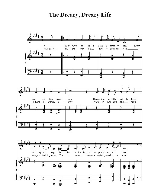 A cowboy's life is a dreary, dreary life,Some say it's free from care;Rounding up the cattle from morning till nightIn the middle of the prairie so bare.Half-past four, the noisy cook will roar,"Whoop-a-whoop-a-hey!"Slowly you will rise with sleepy-feeling eyes,The sweet, dreamy night passed away.The greener lad he thinks it's play,He'll soon peter out on a cold rainy day,With his big bell spurs and his Spanish hoss,He'll swear to you he was once a boss.The cowboy's life is a dreary, dreary life,He's driven through the heat and cold;While the rich man's a-sleeping on his velvet couch,Dreaming of his silver and gold.Spring-time sets in, double trouble will begin,The weather is so fierce and cold;Clothes are wet and frozen to our necks,The cattle we can scarcely hold.The cowboy's life is a dreary one,He works all day to the setting of the sun;And then his day's work is not done,For there's his night herd to go on.The wolves and owls with their terrifying howlsWill disturb us in our midnight dream,As we lie on our slickers on a cold, rainy nightWay over on the Pecos stream.You are speaking of your farms, you are speaking of your charms,You are speaking of your silver and gold;But a cowboy's life is a dreary, dreary life,He's driven through the heat and cold.Some folks say that we are free from care,Free from all other harm;But we round up the cattle from morning till nightWay over on the prairie so dry.I used to run about, now I stay at home,Take care of my wife and child;Nevermore to roam, always stay at home,Take care of my wife and child.Half-past four the noisy cook will roar,"Hurrah, boys! she's breaking day!"Slowly we will rise and wipe our sleepy eyes,The sweet, dreamy night passed away.