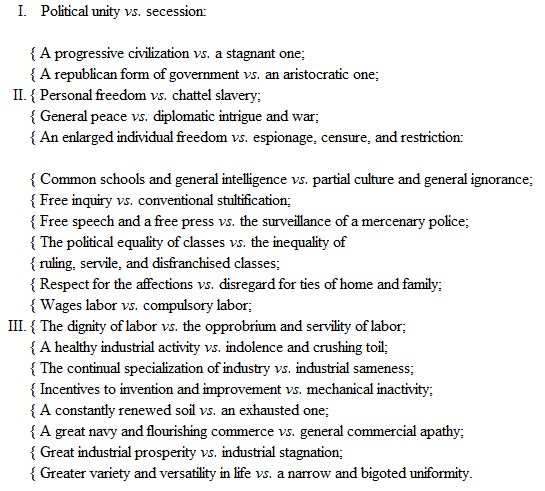 Despotism curtails enterprise, and prevents the specialization of parts and functions as the genuine condition of unity. The free play of intelligence and interest is necessary to develop the diversity upon which unity depends. Let the bare statement suffice. It must come to every careful observer and clear thinker with the authority of a self-evident proposition. Unity and individual freedom are necessary to each other; they act and react, and one implies the other. They go hand in hand; and national unity cannot be violated and broken, without, at the same time, necessitating despotism, and curtailing the individual in the exercise of his legitimate rights. Unity and liberty are mutually dependent and forever inseparable. Hence the inestimable value of unity, the leading issue of the war.