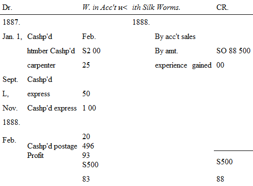 When I received this portentous paper, I observed to Mrs. W.: “My dear, how much do you suppose we got for our cocoons?” “About seventy-five cents,” was the reply. The mind that woman has for detail is simply wonderful.