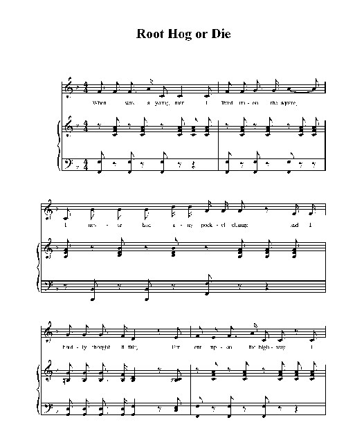 I am a jolly shanty boy,As you will soon discover.To all the dodges I am fly,A hustling pine woods rover.A peavy hook it is my pride,An ax I well can handle;To fell a tree or punch a bullGet rattling Danny Randall.Bung yer eye: bung yer eye.I love a girl in Saginaw;She lives with her mother;I defy all MichiganTo find such another.She's tall and fat, her hair is red,Her face is plump and pretty,She's my daisy, Sunday-best-day girl,—And her front name stands for Kitty.Bung yer eye: bung yer eye.I took her to a dance one night,A mossback gave the bidding;Silver Jack bossed the shebangAnd Big Dan played the fiddle.We danced and drank, the livelong night.With fights between the dancing—Till Silver Jack cleaned out the ranchAnd sent the mossbacks prancing.Bung yer eye: bung yer eye.ROOT HOG OR DIE