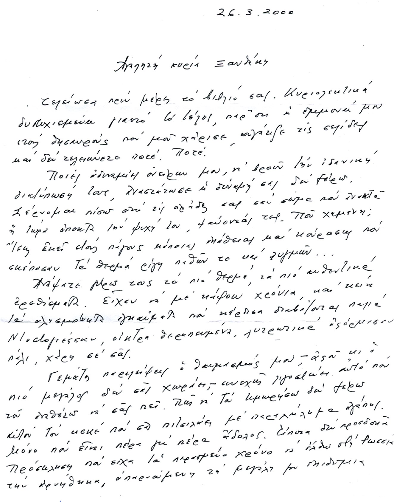 История взаимоотношений Васы Ксантаки с Петербургом – это история любви, любви вечной, любви взаимной. Каждый год, каждую зиму возвращалась она в этот заснеженный город и привозила с собой частицу Греции: книги, сладости, газеты, теплую керамику, музыку… Васа не боялась браться за такие сложнейшие темы, как поэзия Ангелоса Сикельяноса, или «Пир» Платона. С ней, будучи студенткой новогреческого отделения Санкт-Петербургского государственного университета, я впервые почувствовала, как этот язык и культура проникают в мою душу, становясь частью меня самой. Спустя годы, когда я поселилась в Афинах, мы долгими теплыми вечерами спорили с Васой о том, что сапоги из валяной шерсти – не миф, а реальность, переводя кавказскую новеллу Л. Н. Толстого «Казаки».