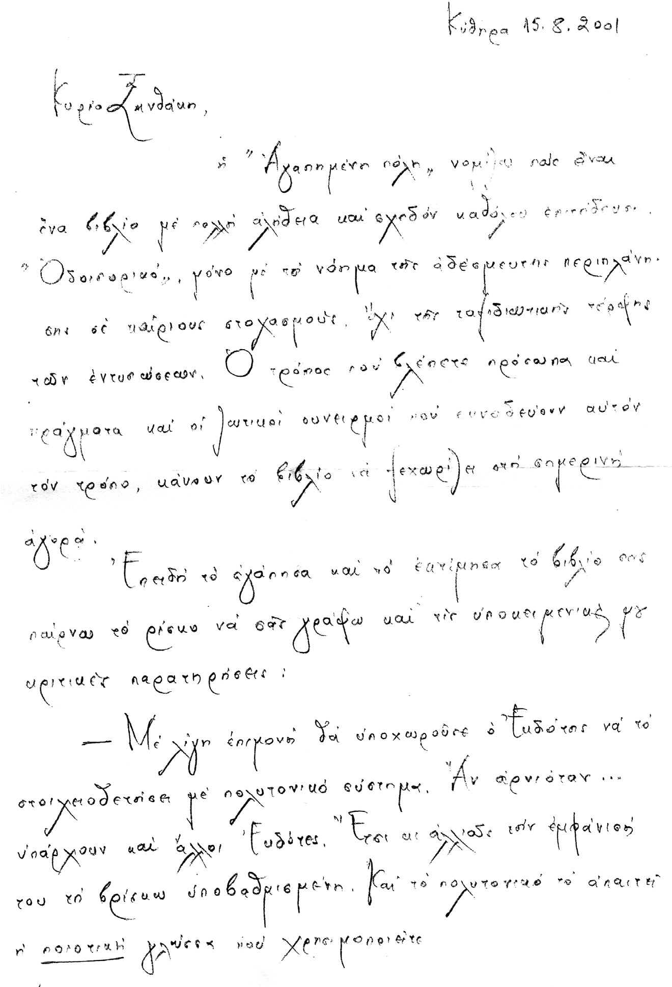 Его давняя мечта вернуться на греческую землю, в Амбелакя7, откуда он был родом, чтобы продолжить там преподавательскую деятельность, воплотилась еще до моего рождения. Еще до моего рождения отец сотрудничал с группами Делмузоса, Глиноса, Триандафиллидиса8, чья деятельность была направлена на реформирование системы образования. Естественно, мой отец подвергся преследованиям во время правления Метаксаса9, особенно за его попытки применить новаторские методы преподавания в Греции. Гораздо позднее в нашей библиотеке в Амбелакя я нашла книгу, написанную Глиносом, с его посвящением, и книга эта была – «Непогребенный мертвец»10.