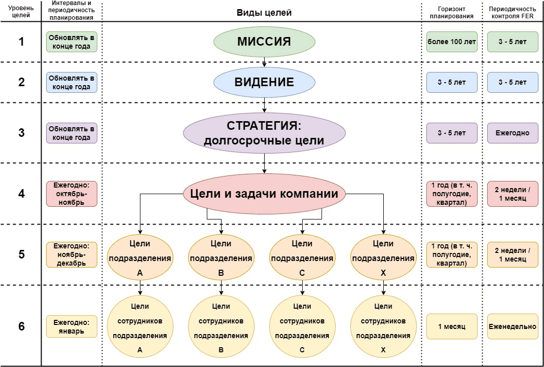 Испробовав на практике несколько моделей управления, мы пришли к выводу, что все цели должны быть измеримыми, то есть уже в момент их постановки важно зафиксировать конечный ожидаемый результат (Final Expected Result, FER), который будет являться подтверждением достижения цели. Как было сказано выше, такой измеримый результат должен быть у каждой цели и подцели, задачи и подзадачи.