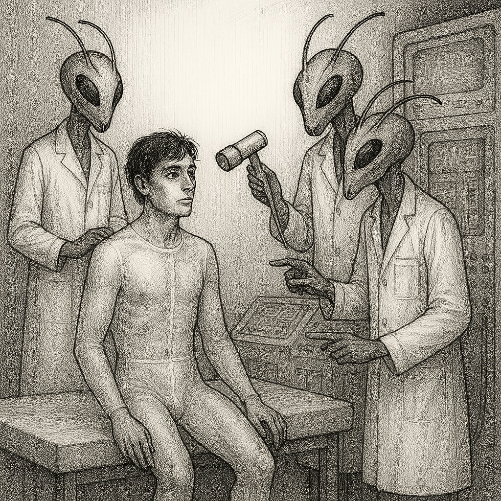 Они были не такие как мы, да и среди нас никогда не ходили. Только проездом по окраине. Мы с парнями часто ходили туда, чтобы посмотреть. Ну-у-у, с проездом я погорячился. В их вагончиках не было колёс, как они передвигались – непонятно, а вот двери отсутствовали. Если смотреть заранее, то можно увидеть их сидящих в креслах, ростом чуть более нашего и очень худых. Головы были ну точь, как у муравьёв, огромные глаза и эти… усики. Такие забавные! Мы смеялись и улюлюкали вслед. Они же тихо сидели молча и смотрели. И больше – ничего, прям бесили этим! Иногда парни даже спорили, можно ли сломать их тело одним ударом ноги. Не, ну это беззлобно, просто ради шутки. Ведь скучно.