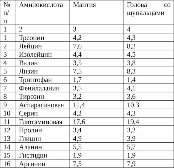Аминокислотный состав белков мантии и головы со щупальцами японской каракатицы.