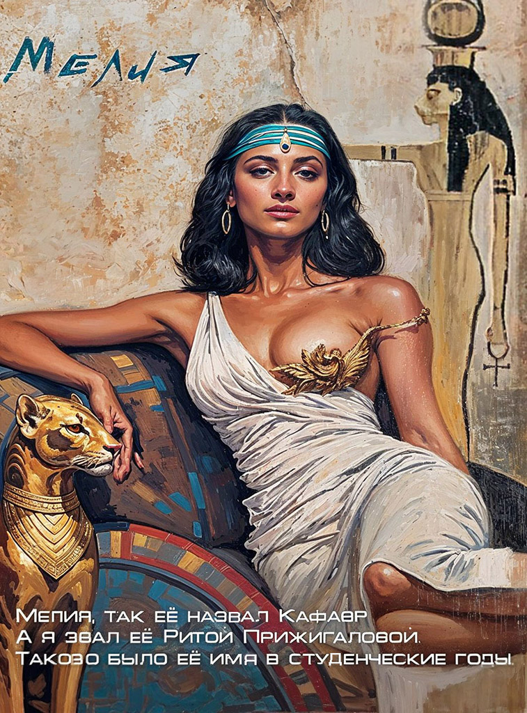 Проходя мимо бассейна, я смог как следует рассмотреть Мелию, грациозно восседавшую в женской половине на богатой резьбы кресле, поглаживающей крашеными хной ногтями золотую статуэтку львицы. Осмотрел я её подобающим образом, всю, целиком – тем более, что прозрачный серебристый лён её платья это сделать позволял. Пара красивых ног, хорошенькое личико и уйма естественных и дьявольски соблазнительных выпуклостей тела.