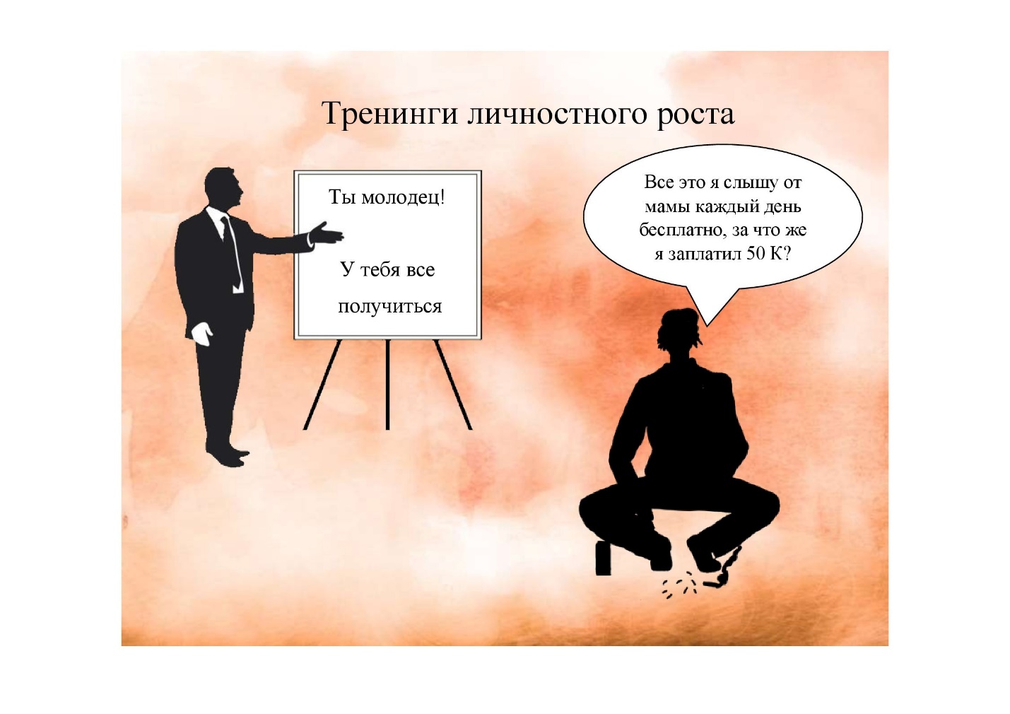 Я говорила, что в этой книге собираюсь, в том числе, затрагивать тему тренингов личностного роста с позиции критика. По этой причине позвольте начать с этого.