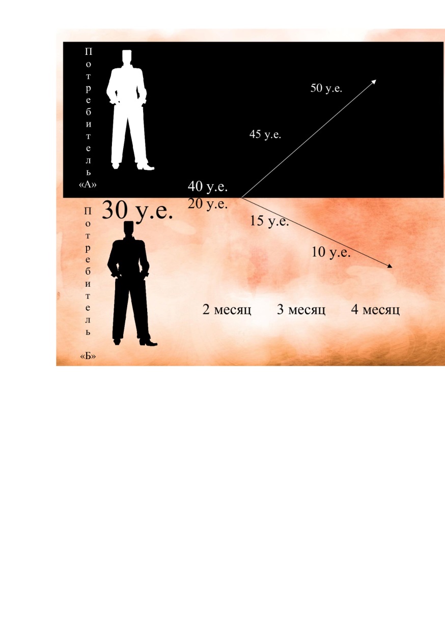 На графике представлены два типа потребителей «А» и «Б», у которых изначально был абсолютно равный доход в 30 условных единиц (далее у. е.) и абсолютно равные условия проживания. Единственное отличие между «А» и «Б» – их стиль жизни. На графике отражён момент их взаиморасчётов друг с другом после получения заработной платы. Потребитель «А» живёт в соответствии с уровнем своего дохода, не привлекая заёмных средств. Потребитель «Б», помимо заработанных им средств, занимает у потребителя «А» 10 у. е. в первый месяц, и в итоге тратит 40 у. е.. В это время, потребитель «А» живёт на 20 у.е.