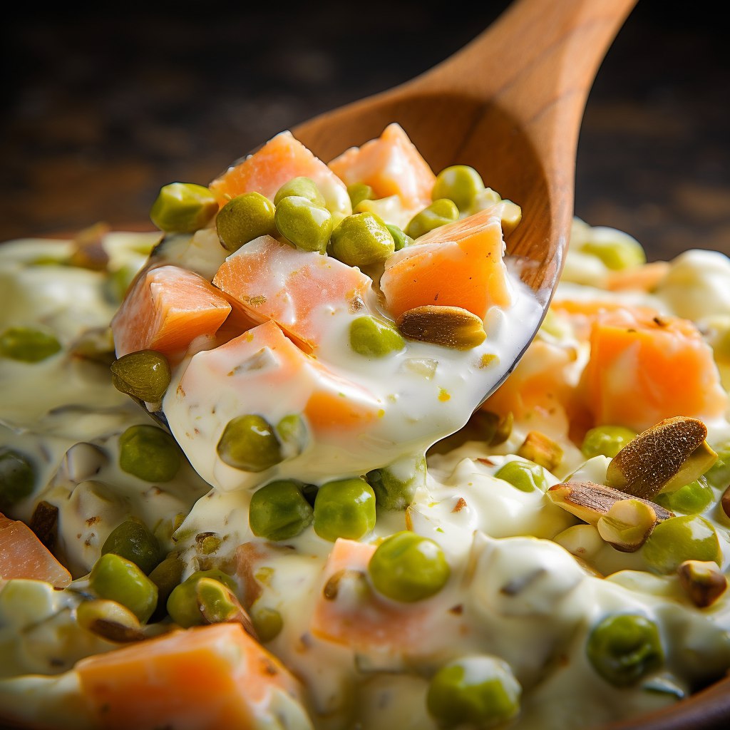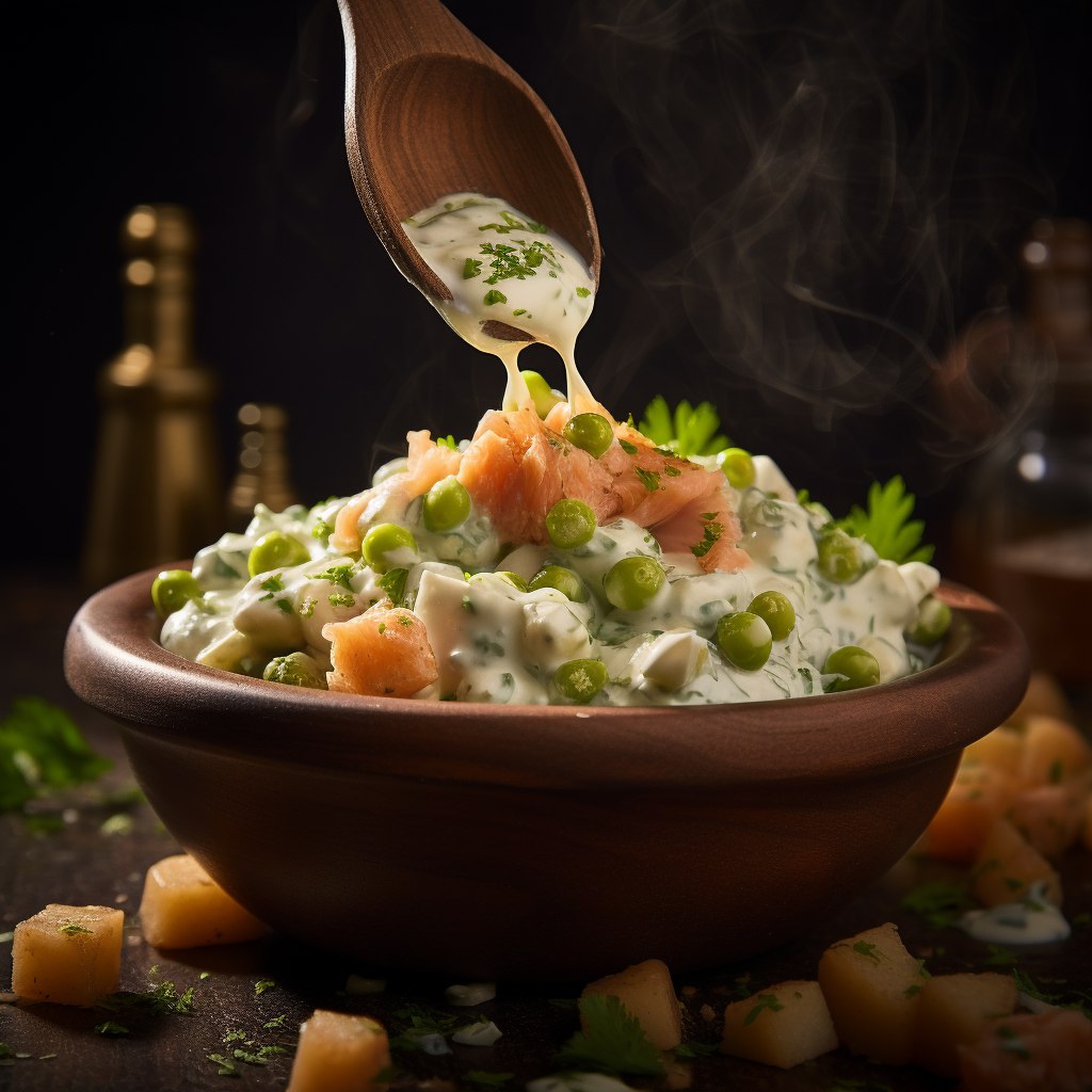 Перейдем к самому важному этапу – смешиванию ингредиентов в салатнице. Бережно соединим лосось, отваренную картошку, зеленый горошек и укроп. Посолим и поперчим по вкусу. Затем аккуратно добавим майонез и тщательно перемешаем, чтобы каждый компонент пропитался ароматным соусом.