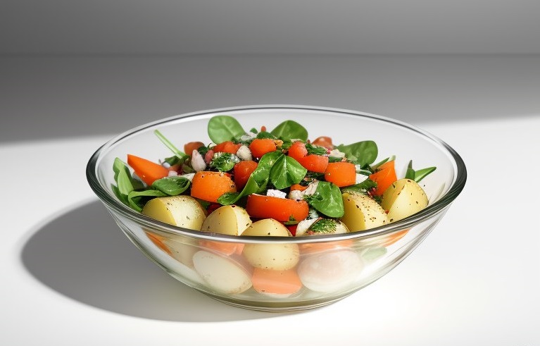 4. Благоприятное сочетание белков и углеводов:* Салат может содержать белки из мяса или других источников белка, а также углеводы из овощей и карбогидратов. Это создает сбалансированный прием пищи.