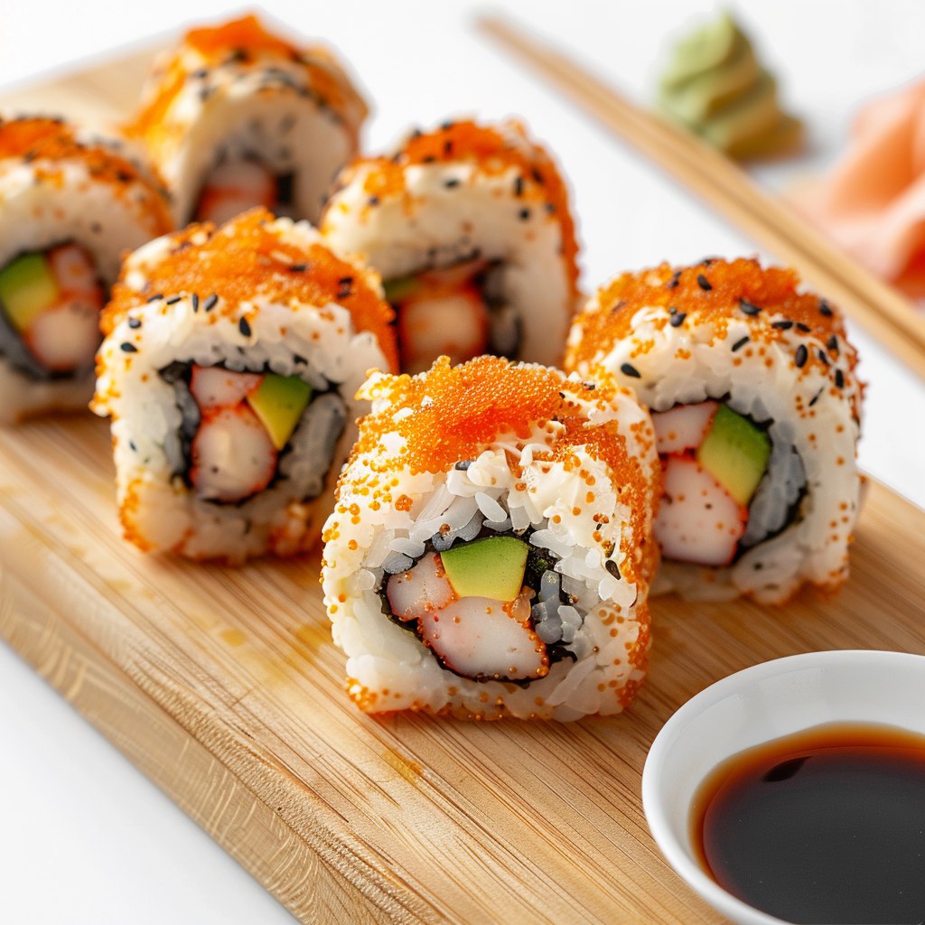 Роллы "Калифорния" обычно имеют яркий внешний вид благодаря икре тобико, которая обсыпает ролл снаружи. На вкус они лёгкие и свежие, с балансом между мягким авокадо, хрустящим огурцом и слегка сладковатым крабовым мясом.
