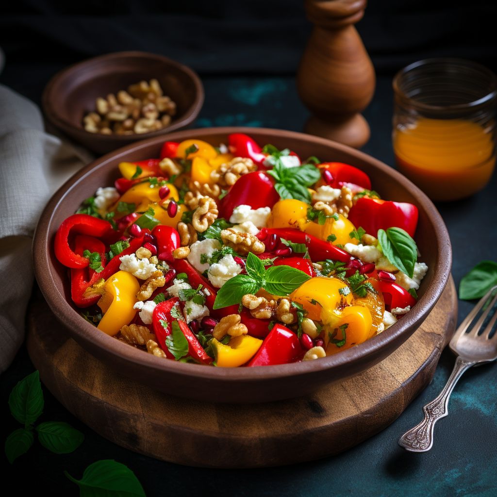 Однажды, вечером перед ежегодным праздником, Исабель вдохновилась создать салат, который бы отражал все яркие цвета ее перцев и мог бы удивить гостей. Она решила добавить к перцам такие ингредиенты, как гранат, орехи и сыр фета, чтобы создать истинный калейдоскоп вкусов и текстур.
