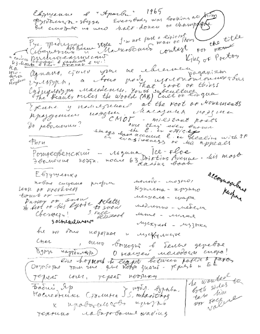 Распутин. Чудесно, да. Солженицын, «В круге первом», – я бы рекомендовал прочесть. Потому что «Один день Ивана Денисовича» – это еще его советский период. Затем «Архипелаг ГУЛАГ» – это… ну, все знают, что это такое, но в смысле литературном «В круге первом» гораздо сильнее и интереснее. Нужно достать где-то «Пушкинский дом» Андрея Битова. Я тоже его не нашел почему-то. У «Ардиса» заказать? Не было. У меня [в списке] двадцать пять названий, это слишком много, конечно, для студентов, нужно как-то выбирать, кто что захочет. «Сандро из Чегема» Фазиля Искандера. Это интересно будет прочесть по двум причинам: во-первых, как явление неподцензурного романа, который пережил две судьбы – цензурную (он издан в Советском Союзе с определенными купюрами) и неподцензурную судьбу (он [вышел в] издательстве «Ардис» уже полным текстом), – то есть он живет двумя жизнями. И, кроме того, интересное явление представляет [сам] Искандер, явление национальной литературы на русском языке, это довольно необычное явление, существующее только в Советском Союзе, когда авторы национальных республик, моего поколения примерно люди, воспитанные еще вне века растущего и цветущего национализма, не получили достаточно родного языка, чтобы писать книги на нем, и получили более-менее достаточно русского языка, чтобы иметь возможность писать на нем книги. Но не вполне точно получили – их язык отражает национальность, и они пишут о своем национальном характере, о национальной психологии. Получается любопытный сплав. К ним я бы еще отнес одного из самых established советских райтеров (смеется) – Чингиза Айтматова. Он лауреат всех премий, депутат Верховного Совета, он на самом верху общества, но, несмотря на это, писатель довольно талантливый. Затем альманах «Метрополь», конечно, надо прочесть или хотя бы просмотреть всем. Так же как новый альманах «Каталог», но главное – «Метрополь», это важнее. Владимир Войнович. Я думаю, его нетрудно будет достать, «Приключения солдата Ивана Чонкина» – это просто интересное чтение, забавное. И очень важно прочесть Георгия Владимова, «Верный Руслан», – это один из крупнейших писателей современных, еще оставшихся в Москве. Затем есть два представителя так называемого андерграунда московского, который так и называется английским словом underground: Венедикт Ерофеев, его «Москва – Петушки» – блестящая сатирическая, лирическая, гиперболическая маленькая повесть, очень ее рекомендую просто для удовольствия, кроме всего прочего, и Эдуард Лимонов, сейчас живущий в Париже, его нью-йоркские приключения описаны в повести «Это я, Эдичка». И последний в списке молодой писатель и, на мой взгляд, самый интересный стилист молодого поколения – Саша Соколов, живущий в Америке. Его книгу «Между собакой и волком» достать нетрудно. Затем у меня есть список поэзии, которую вы явно нигде не достанете, это книги из моей собственной библиотеки, которые подарены сто лет назад авторами, и я вам буду давать по своему выбору какие-то стишки оттуда, и, может быть, вы эти стишки будете ксерокопировать. Ну, например, вот вторая книга Беллы Ахмадулиной, «Уроки музыки»; ее первая книга тоже у меня есть, называется «Струна», вот она. Евтушенко – очень старая книга «Со мною вот что происходит». Роберт Рождественский, который был в молодости молодым человеком (смеется), называется «Дре