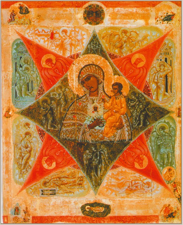 Богоматерь изображаема была всегда с тремя звездочками на Ее покрывале, из которых одна помещалась на главе, а две на раменах, символизируя тем тройственное Ее присно– девство: до рождества, в рождество Спасителя мира и по рождестве Его.