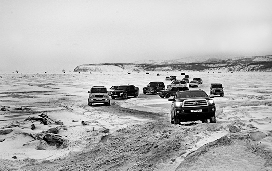 В остальное время я существую около. Мои окна выходят на Амурский залив. На том берегу – синие сопки, куда (это уже почти Китай) каждый вечер обречённо и стремительно, как катящаяся с гильотины голова огненного великана, зарывается раскалённый грейпфрутовый шар. Когда встаёт лёд, сахарная поверхность окаменевшего моря покрывается дорожной сетью – тёмными извивающимися ниточками на белом панцире. На этих ниточках завязываются узелки-парковки – теперь у рыбаков много машин. Если смотреть на залив утром, до рассвета, цепочки красных и белых огоньков на ещё не видимом льду напоминают загадочные «блуждающие огни» или секретный фарватер из советского фильма. Скоро на заливе возникнут пробки. Как-то я попал в настоящую пробку на льду магаданской бухты Гертнера. Отчаянный рыбак на легковой «пузотёрке» Nissan Sunny не мог перебраться через торос, отделяющий море от берега. Железному потоку люксовых японских «крузаков», пафосных американских «тундр» и военно-колхозных отечественных УАЗов пришлось ждать – в других местах выбраться на берег было невозможно даже им.