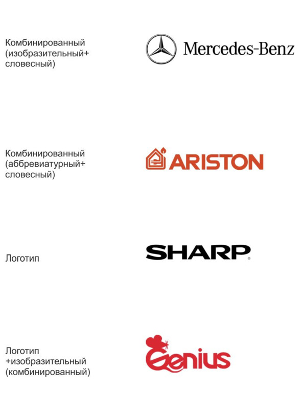 Словесный товарный знак – графическое шрифтовое изображение, которое используется для идентификации только данной фирмы или товара, не несущее изобразительных элементов (включают в себя логотипы и аббревиатуры).