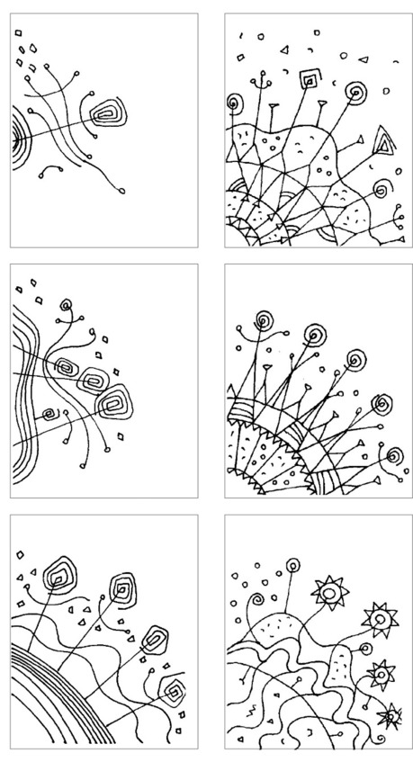 Легко, без усилий, ведомый блуждающими мыслями синквейна*, простой линией гелевой ручки создаю образные графические знаки и композиции. Знак это условно лаконичное изображение, композиция – сочетание знаков. Знаки и композиции строятся из линий и плоскостей. Все формы живут своей жизнью: пересекаются, прилипают друг к другу, находятся на расстоянии, также могут быть пластичными, угольными, стилизованными и насыщенными ритмами. Вариации силуэтов, статики, динамики, ритмов, тона, организации форм по фразам и контурным линиям – это клавиши музыкального инструмента, с помощью которых получаем визуальную музыку, романтичность образов.