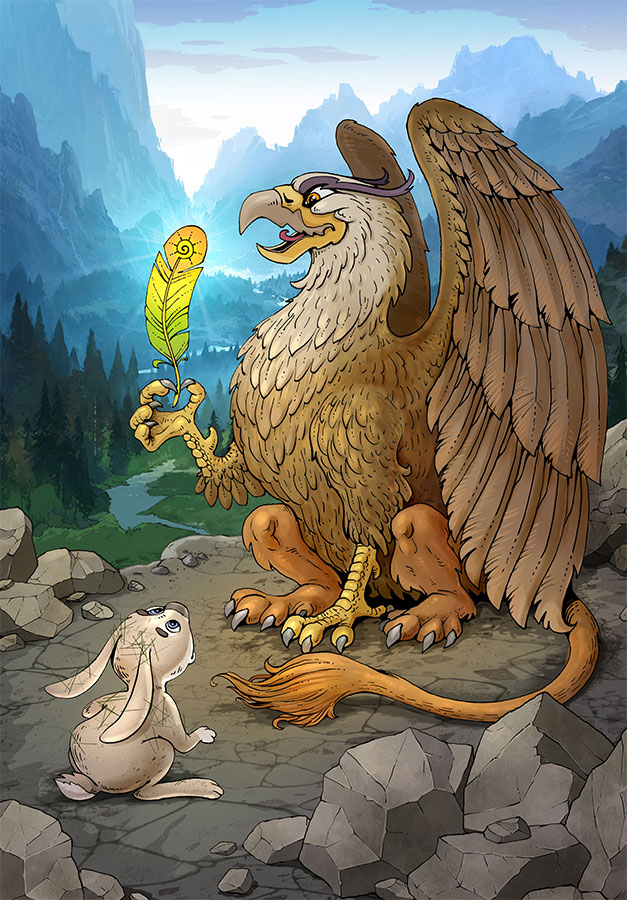 Старый грифон положил зайцу на спину светящееся перо. Длинноухий почувствовал, что его спина как будто укрепляется. Прошло несколько мгновений – и вот что-то защекотало его нос. То были перья его собственных крыльев.