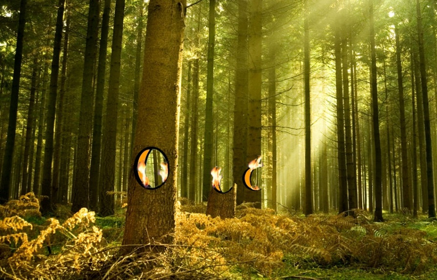 Плазменный шар прожег три дерева подряд, первый по центру, двум остальным до самой средины выжег бока и еще шматок мелких.