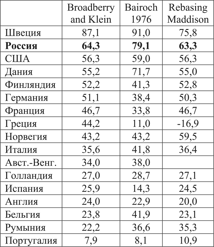 Индустриализация действительно принесла свои плоды, вместе с Первой русской революцией, освободившей крестьян от выкупных платежей, с реформами Столыпина и благоприятной экономической конъюнктурой 1910-х гг. (ростом мировых цен на хлеб), не смотря на огромные финансовые потери в русско-японской войне, индустриализация привела к опережающему росту российской экономики. По темпам роста ВВП за 1890–1913 гг. Россия заняла второе место в мире, после Швеции (Таб. 1). Стремительный экономический рост России, казалось, выводил ее из состояния полуколонии Запада…