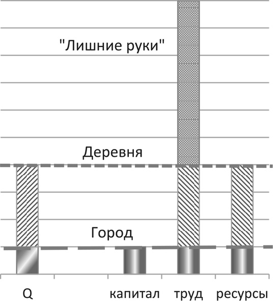Для вступавшей в капитализм российской промышленности лимитирующим фактором являлся недостаток Капитала, который предопределял возможные объемы производства, свыше которого все остальные факторы – в том числе и труд являлись просто «излишними». Эти «лишние руки» концентрировались в деревне, борясь за выживание в рамках своего полунатурального аграрного хозяйства. И в деревне мальтузианский закон действовал с еще большей силой и неотвратимостью: лимитирующим фактором в полуфеодальной деревне являлся прежде всего природный ресурс – земля. (Пропорции графика (Гр. 2), примерно соответствуют распределению факторов производства в России начала ХХ века.)