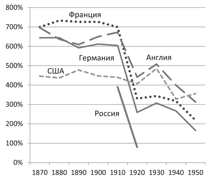 Потерю частного капитала во время Первой мировой Д. Кейнс назвал «Эвтаназией рантье». Попытку оценки размеров этой «эвтаназии» для ключевых участников, за исключением России, сделал Т. Пикетти (Гр. 3). Бедность России капиталами и полный провал всех попыток мобилизации экономики привел к тому, что в России процесс «эвтаназии» зашел гораздо дальше. Косвенно о масштабах этого явления говорил уровень инфляции, по которому уже к концу 1917 г. Россия обгоняла основных союзников и противников почти в 5 раз[314]!