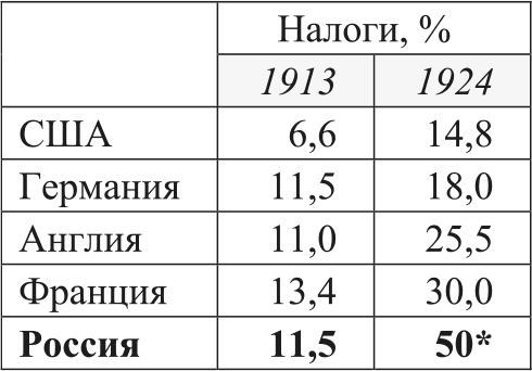 Но потеря капитала во время войны будет только началом: «Война не оплачивается в военное время, – указывал один из отцов основателей США Б. Франклин, – счет приходит позже». Во время войны этот счет накапливается в виде «будущих налоговых обязательств» (future tax liability)[320] или «отсроченной инфляции»[321]. Для оплаты этого счета, на ликвидацию последствий войны, будет необходимо, предупреждал в декабре 1916 г. С. Прокопович, «обложение народного дохода приблизительно в 50 %. Государство должно будет взять у народа около половины его годового дохода»[322]. Для России это означало увеличение довоенной налоговой нагрузки, почти в 5 раз! (Таб. 4)