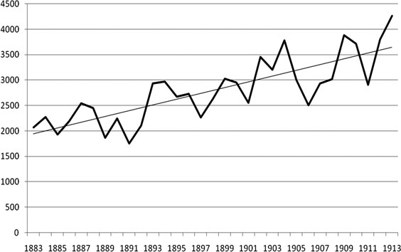 Доходы государственного бюджета за этот период увеличились почти в 5 раз, а растущее с 1885 г. отрицательное сальдо государственного бюджета сменилось с 1907 г. на положительное[26].