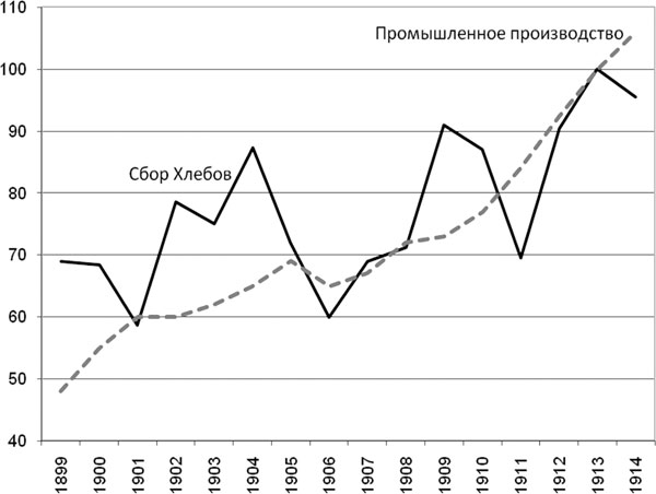Действительно динамика основных валовых показателей Российской империи накануне Первой мировой войны убедительно свидетельствовала о ее уверенном и стремительном экономическом росте. Наиболее наглядным показателем для аграрной страны являлся сбор всех хлебов, который только для европейской части страны за 50 лет вырос почти в 2 раза. Рост обеспечивался не только за счет увеличения посевных площадей, но также и более широкого применения современных сельскохозяйственных орудий, машин и улучшения приемов агротехники[5] и т. п.[6]