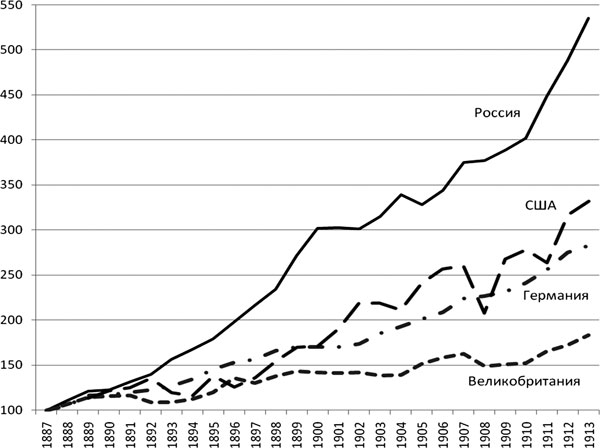 Известный издатель А. Суворин накануне смерти в 1911 г. отмечал: «за мою жизнь… Россия до такой степени страшно выросла… во всем, что едва веришь. Россия – страшно растет»[15]. Об этом росте наглядно свидетельствовали показатели роста промышленного производства в России: