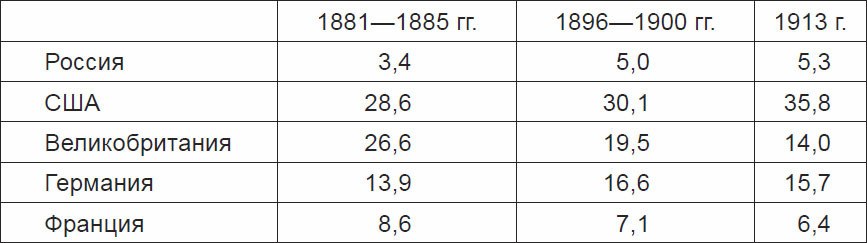 По темпам роста промышленного производства в 1870–1913 гг. Россия занимала первое место в мире. За 20 лет (1893–1913 гг.) производительность труда в промышленности выросла почти в 4 раза, производство инвестиционных товаров увеличилось в 7 раз, чугуна – в 5, стали – в 13, добыча угля – в 5 раз, переработка хлопка – в 7, производство сахара – в 4 раза, и т. д. Если в 1860 г. механическое оборудование в целом по стране оценивалось в 100 млн руб., то в 1913 г. – 2 млрд руб.