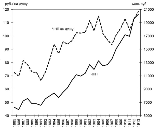 С 1900 по 1913 гг. чистый национальный продукт России почти удвоился, а ее доля в мировом хозяйстве в 1913 г. достигла 7 %. При этом, сообщал Э. Тэри своим читателям, «Русские… сами производят свои паровозы, железнодорожное оборудование, военные и торговые суда, все свое вооружение и большое количество скобяных изделий: хозяйственных предметов, земледельческих орудий, труб и т. д.»[18].