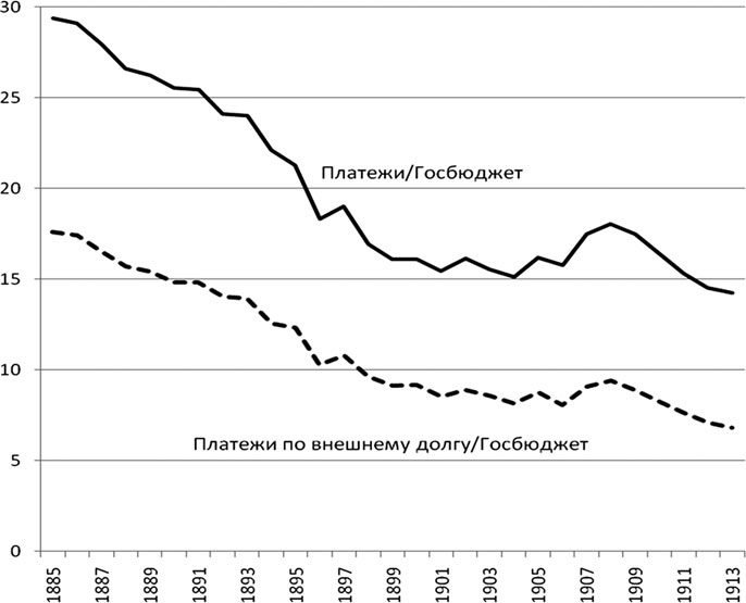 Финансовое положение России, несмотря на то, что она была крупнейшим должником Европы, неуклонно улучшалось, о чем говорит снижение доли платежей по государственному долгу в доходах госбюджета.