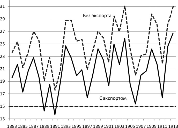 График наглядно демонстрирует ставшей крылатой фразу министра финансов И. Вышнеградского (1880–1892 гг.): «Недоедим, а вывезем». Эта практика вошла в историю под названием «голодный экспорт»[58]. Министр земледелия тех лет А. Наумов писал: «Россия фактически не вылезает из состояния голода, то в одной губернии, то в другой»[59]. Министр иностранных дел России В. Ламзодф: «От просящих хлеба нет прохода. Окружают всюду толпой. Картина душераздирающая. На почве голода тиф и цинга». Известный публицист начала века М. Меньшиков приходил к печальным выводам: «Народ наш хронически недоедает и клонится к вырождению… »[60].