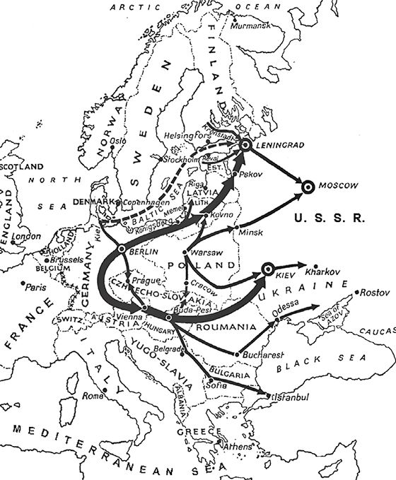 Северо-Балтийское направление позволяло, во-первых, создать мощную непосредственную базу для нападения на СССР. На всех прочих путях германской армии пришлось бы проделать длинный, трудный и весьма сомнительный переход по чужой территории с враждебным населением и неразвитым железнодорожным сообщением. Во-вторых, этот путь вел прямо к жизненному центру Советского Союза![26]