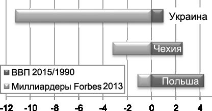 Но может быть олигархия – передовой отряд украинского бизнеса, создает условия для развития страны? – Для ответа на этот вопрос стоит сравнить Украину с ее ближайшими соседями, находившихся в сопоставимых политических и экономических стартовых условиях, после разрушения Советского Союза, а именно с Польшей и Чехией:
