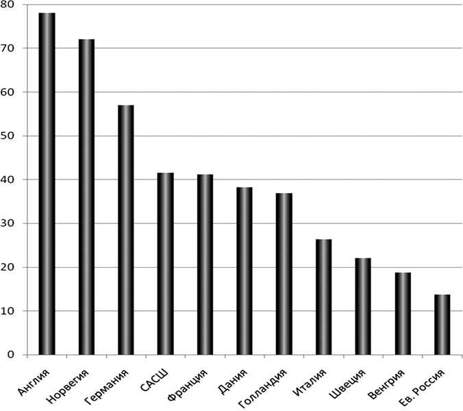 Несмотря на общие закономерности перехода от аграрного к индустриальному обществу, Россия значительно отставала в этом вопросе от стран Запада. Величину этого отставания наглядно демонстрирует ключевой для переходного периода показатель – доли городского населения. По этому показателю даже Европейская часть России уступала основным конкурентам, например, таким как Англия или Германия в 4–5 раз.
