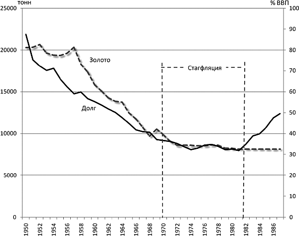 Результатом роста инфляции издержек стало появлении стагнации уже в 1970 г. Отказ от долларового стандарта вел к падению номинальной стоимости доллара и новому скачку инфляции. Предвидя это, администрация Никсона в 1971 г. ввела 10%-ный налог на импорт, а также установила контроль над ценами и заработной платой. В результате после отказа США от золотого паритета, главный удар спекулятивных капиталов пришелся не на реальный сектор, а на ключевые биржевые товары, вызвав стремительный рост цен на них и прежде всего на золото. Цена последнего уже в 1972 г. взлетела на 45%, а к 1973 г. более чем удвоилась. Одновременно вверх рванули цены на продовольствие, а в 1973 и 1978 гг. произошел скачок цен на нефть, который Дж. Сакс назовет «квинтэссенцией стагфляционного шока»[109]. Рост цен на биржевые товары привел к новому витку роста инфляции издержек.