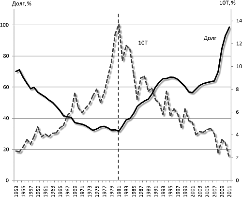 Динамика процентных ставок по 10-летним Т-облигациям и федерального долга США[128]